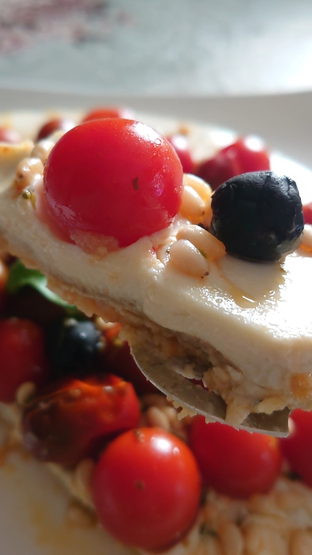 En el momento de la degustación acompañada de los tomatitos cherry confitados con ajo y albahaca fresca ,la rúcula ,las olivas negras y los piñones es como meterse un pedacito de Italia en la boca. Una maravilla !!